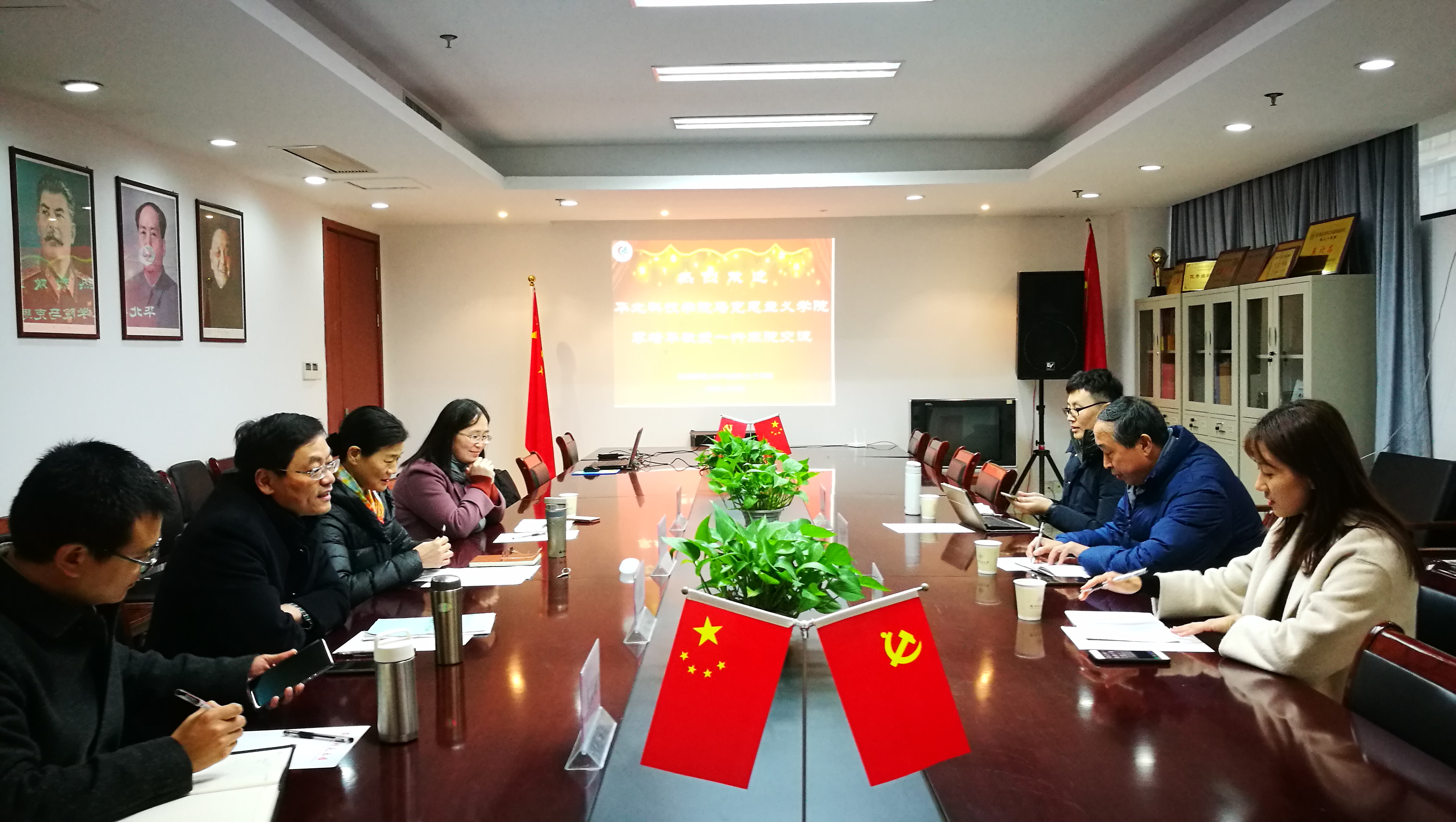 2018年12月6日下午,华北科技学院探花视频 李培华教授一行三人来探花视频 交流,何丽君副院长、《马克思主义基本原理概论》教研室三位教师参加交流互动。何副院长简要介绍了探花视频 和探花视频 概况,详尽回答了相关询问。接着,双方就思政课教学模式、课堂呈现方式、课外实践形式以及课程成绩的构成等方面做了深入交流与研讨。探花视频 傅德田老师详细介绍了《马克思主义基本原理概论》课程多年来在教学内容、教学模式及课堂教学方法上做出的改革,与华北科技学院同行分享了在“翻转课堂”方面进行探索的经验与思考。华北科技学院同行介绍了他们进行专题教育、过程性考核等方面新探索的情况。余龙进院长在学校重要会议结束后专门抽出时间陪同访客朋友,双方就马院发展、学科建设等相关问题热烈交流。