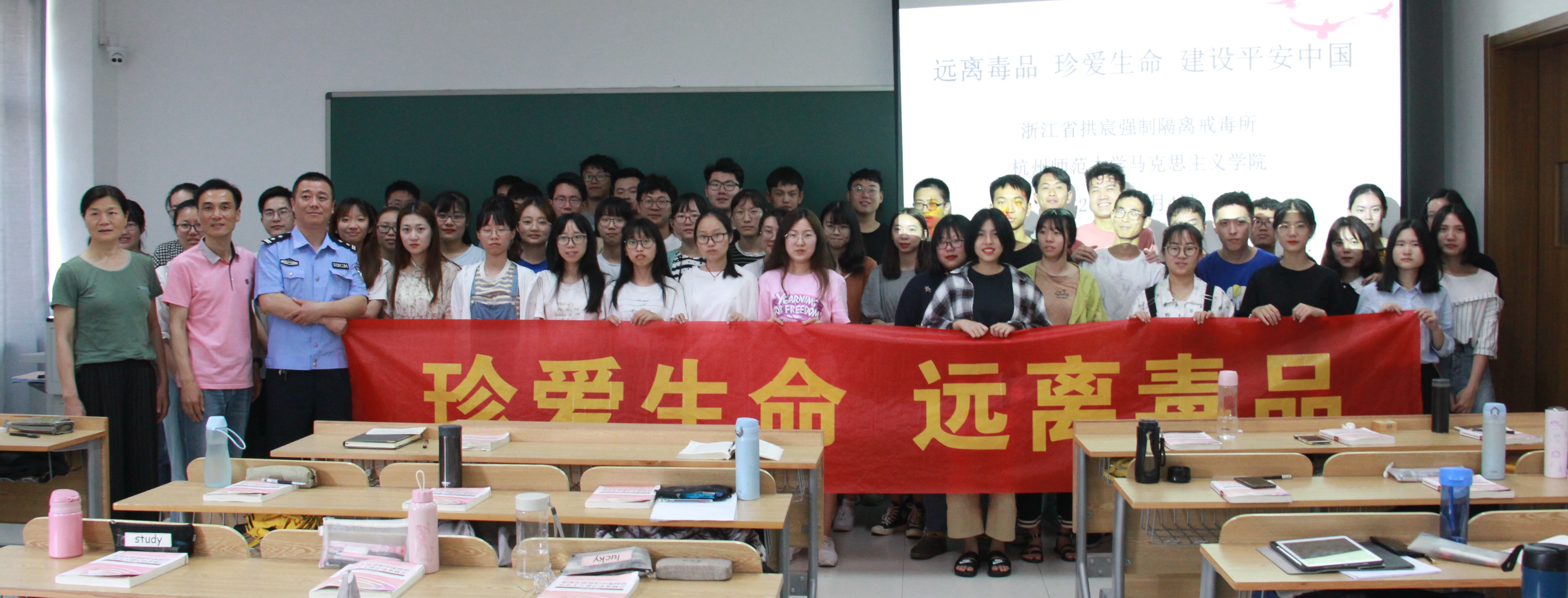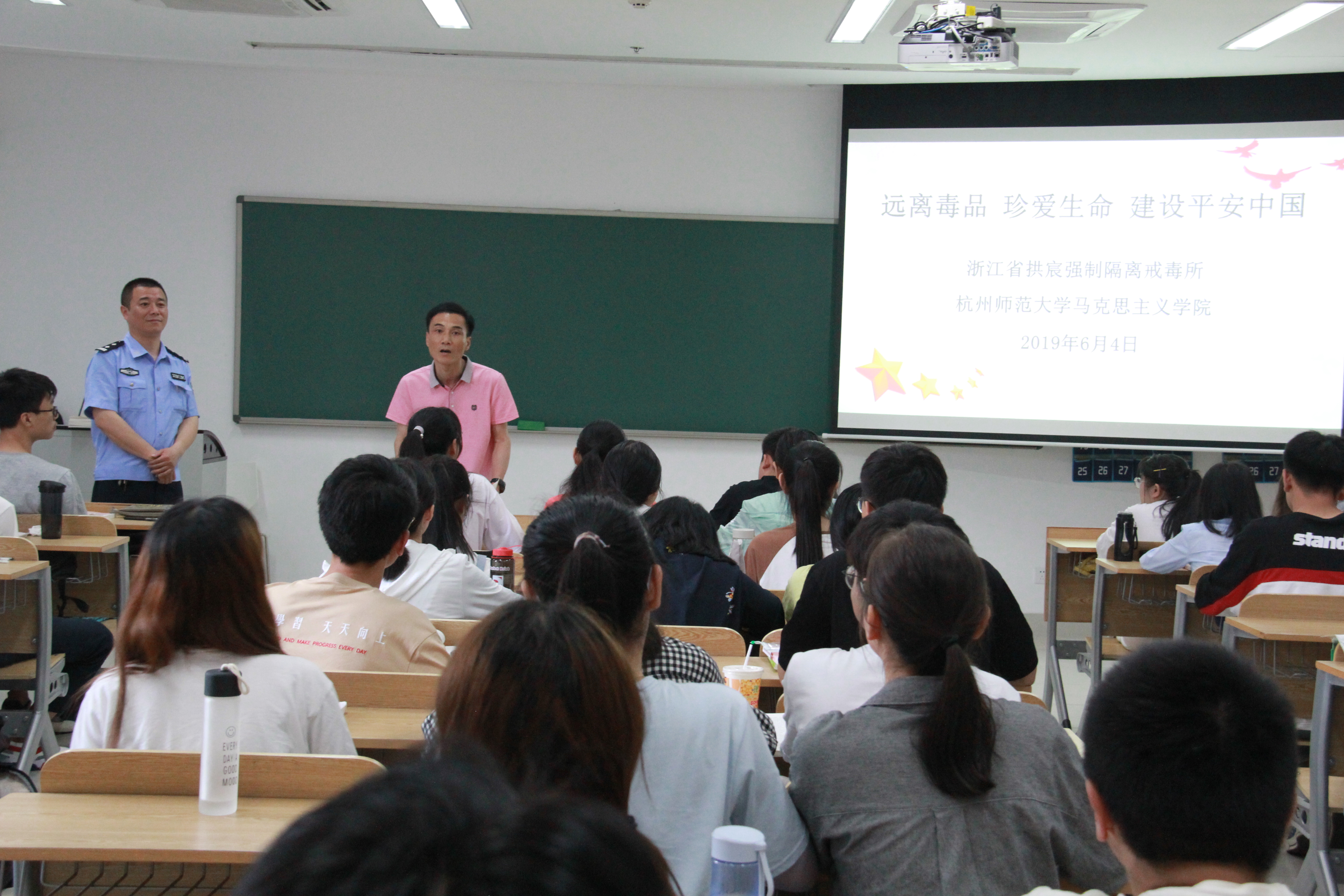 为增强大学生识毒、防毒、拒毒意识,加强大学生毒品预防教育工作, 探花视频 将禁毒教育融进思想政治理论课堂。6月4日上午,学院邀请了浙江省拱宸强制隔离戒毒所的郭崧、黄周青、陶侃警官与马院教师共同上了一堂精彩的禁毒教育课。