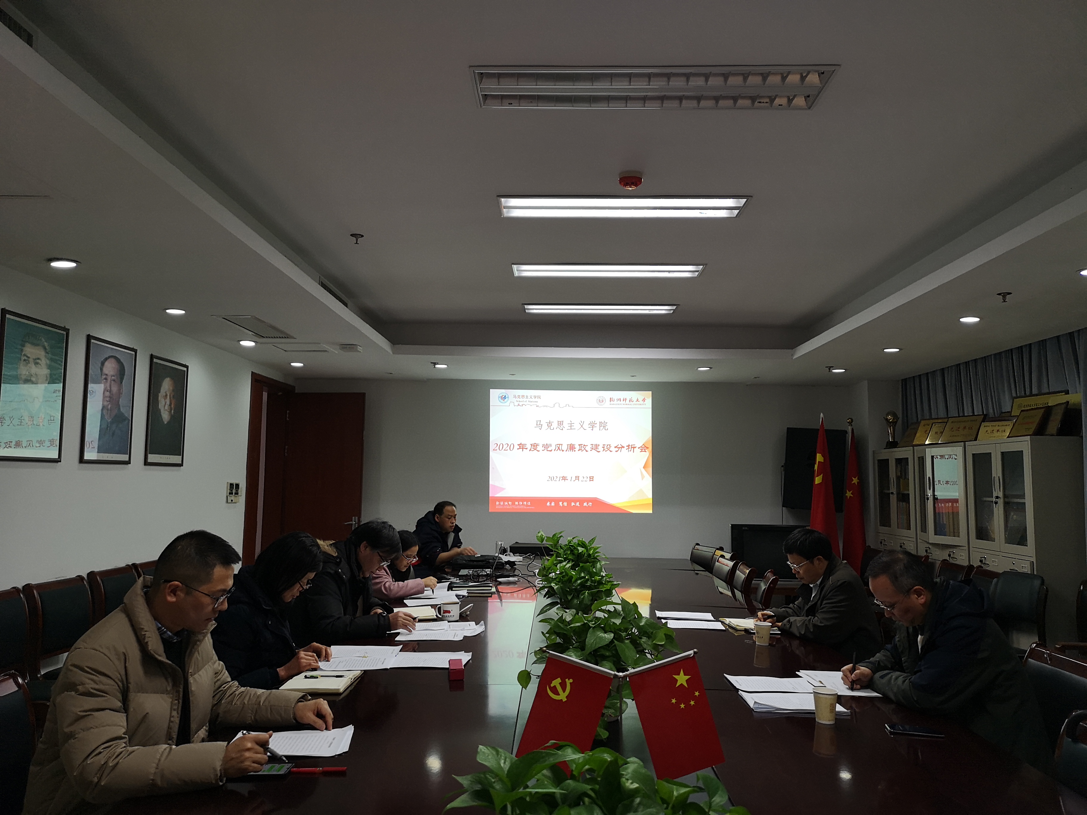 2021年1月22日下午,探花视频 在恕园1号楼306会议室召开学院年度党风廉政建设分析会,校党委副书记应飚出席会议并讲话,校纪委委员王平、学院党总支全体成员参加会议。