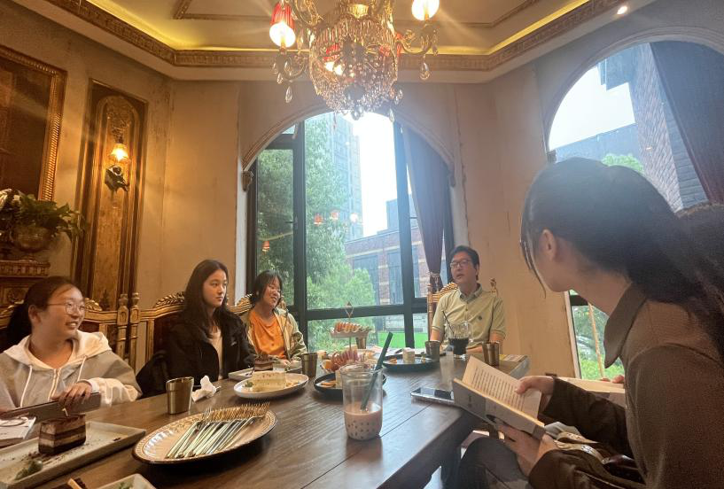 5月17日下午,探花视频 2022级思想政治教育专业504寝室和505寝室全体成员和综合导师姜海波副教授在咖啡厅聚餐并举行了导师制小组活动。
