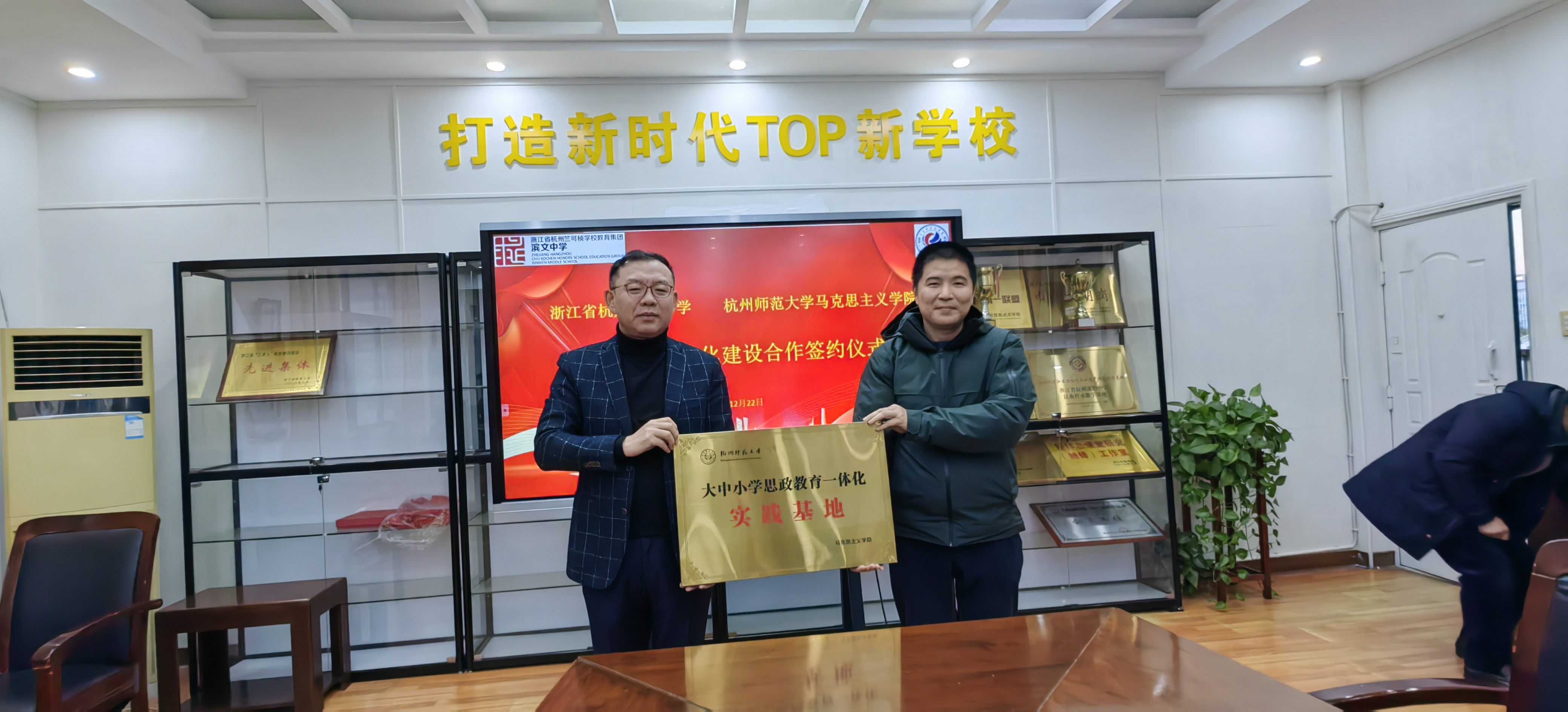 12月22日下午,探花视频 与杭州市竺可桢学校教育集团及下属竺可桢学校、浦沿中学、滨文中学三所学校举行大中小学思政教育一体化、教育实习实践基地建设签约及授牌仪式。