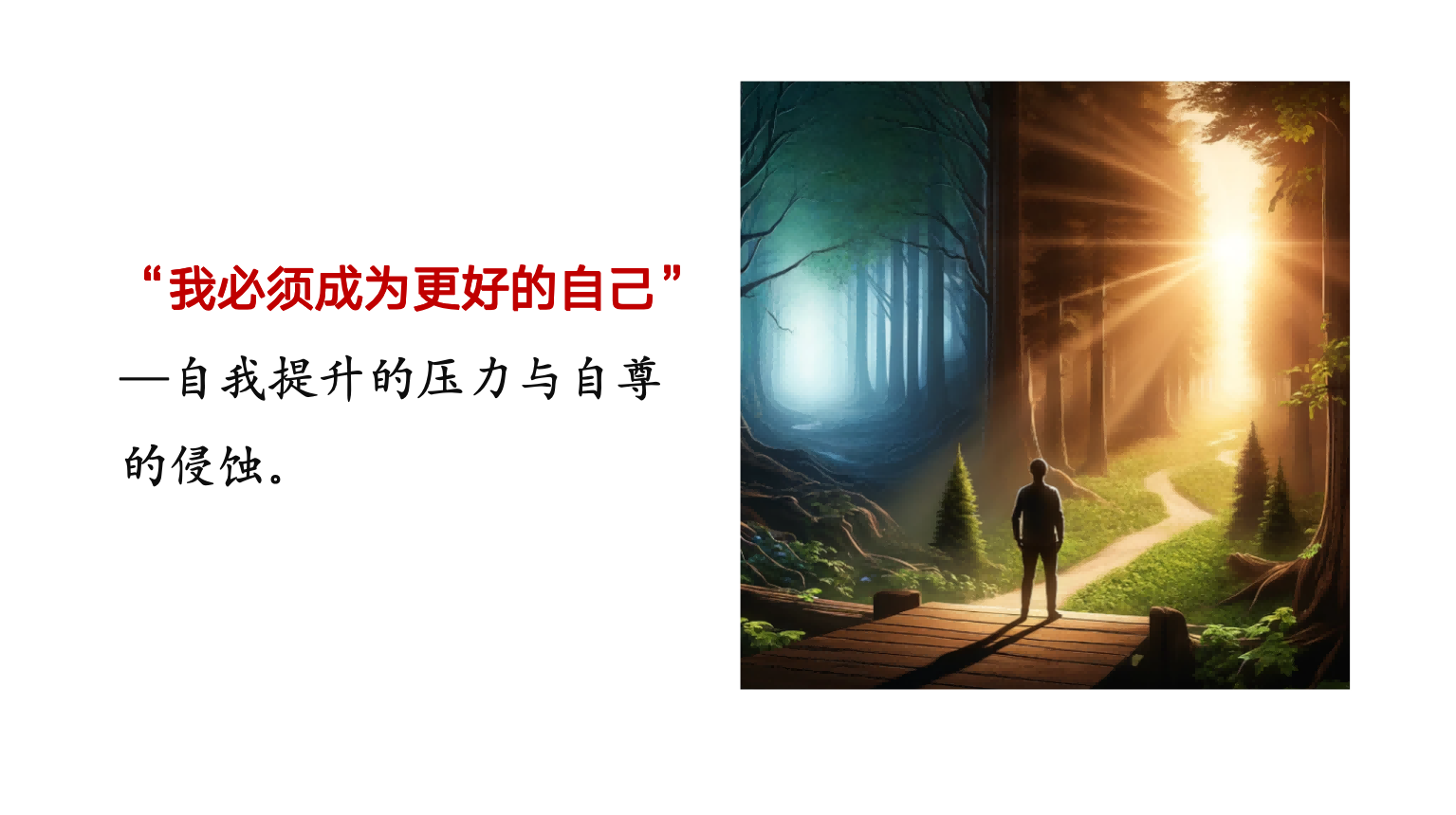 本次微课内容涵盖自我提升的压力、生活中的效率焦虑、灾难化思维等多个方面,探讨了内心对话如何悄悄影响我们的生活。内心的的声音有时会推动我们前进,但有时也会带来压力和否定感。例如,“我必须成为更好的自己”可能会导致自我否定和攻击,而“我要更高效”则可能导致高效焦虑和疲惫。胡老师提出了几个常见的内心独白,并分析了它们可能带来的负面影响,旨在帮助学生识别、理解并应对生活中可能遇到的各种心理挑战。