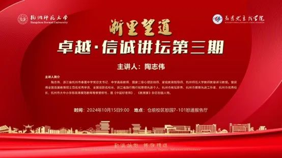 10月15日上午,“浙里望道”:卓越•信诚讲坛第三期在探花视频 仓前校区恕园恕道报告厅隆重召开。杭州市春蕾中学党总支书记陶志伟,探花视频 党委书记、院长李洪波、教务科科长梅慧英,经亨颐教育学院李淑杰老师与探花视频 学科教学(思政)专业研究生(复硕)24人,思想政治教育(师范)大三学生133人共同参与了此次讲坛,深入探讨了养成和提升教师素养的过程与方法。此次讲坛由梅慧英老师主持,陶志伟书记主讲。