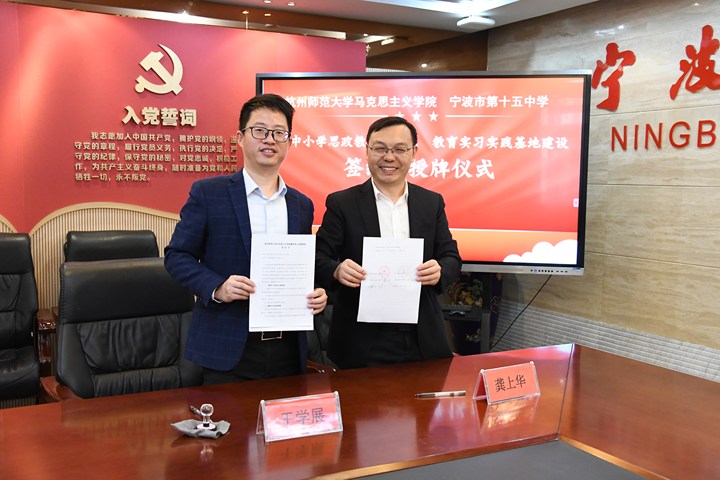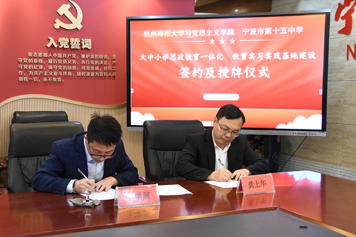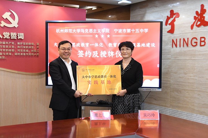 探花视频 副院长龚上华教授与宁波市第十五中学校长干学展、党委书记吴巧玲代表双方分别举行了教学实习实践基地建设的合作签约和大中小学思政教育一体化实践基地的授牌仪式。