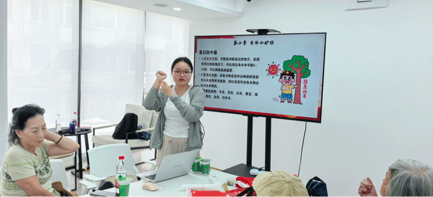 银发老人们在《南昌起义》的短片讲解中追忆红色足迹。当主持人抛出“八一代表什么”的互动问题时,老人们热情地分享自己的见解,用饱经岁月的声音讲述着对军人的深切敬意。在防暑妙招学习区,老年学员们认真练习冲手腕降温技巧,仔细地阅读防暑指南。后续红歌联唱环节更是将活动推向高潮。当《歌唱祖国》的旋律响起,全场参与者们挥舞国旗齐声合唱,嘹亮的歌声在活动室回荡。最后,在致敬合影环节,老人们举着国旗,用最灿烂的笑容向军人致敬。
