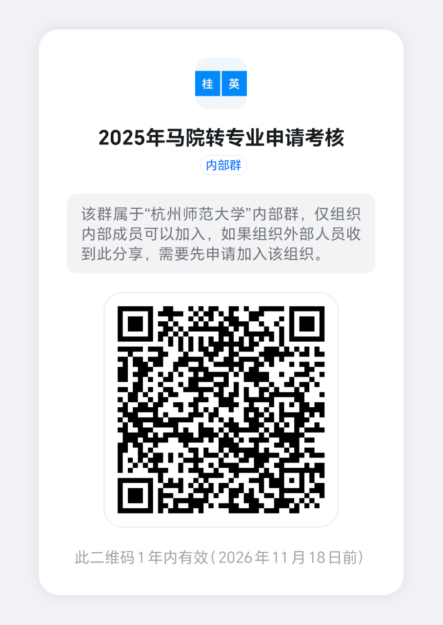 各位同学,根据学校2025年转专业的总体安排,结合学院实际,请拟申请转专业学生根据以下探花视频 转专业考核方案及考核安排来操作。报名需提交转专业申请表纸质材料,提交地点:下沙校区行政楼212,仓前校区恕园26-304。系统报名成功的学生请加入马院转专业通知钉钉群,二维码: