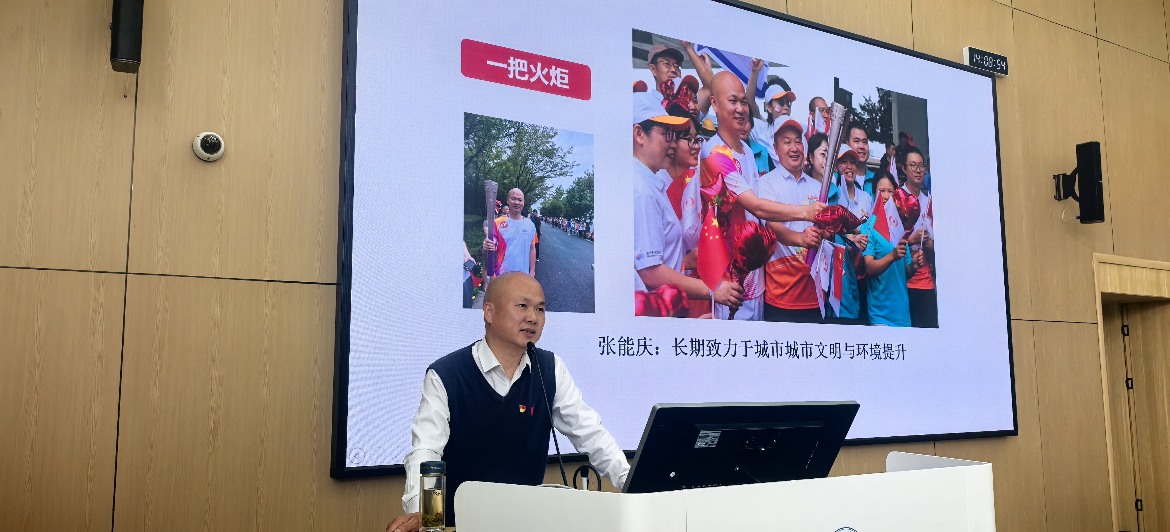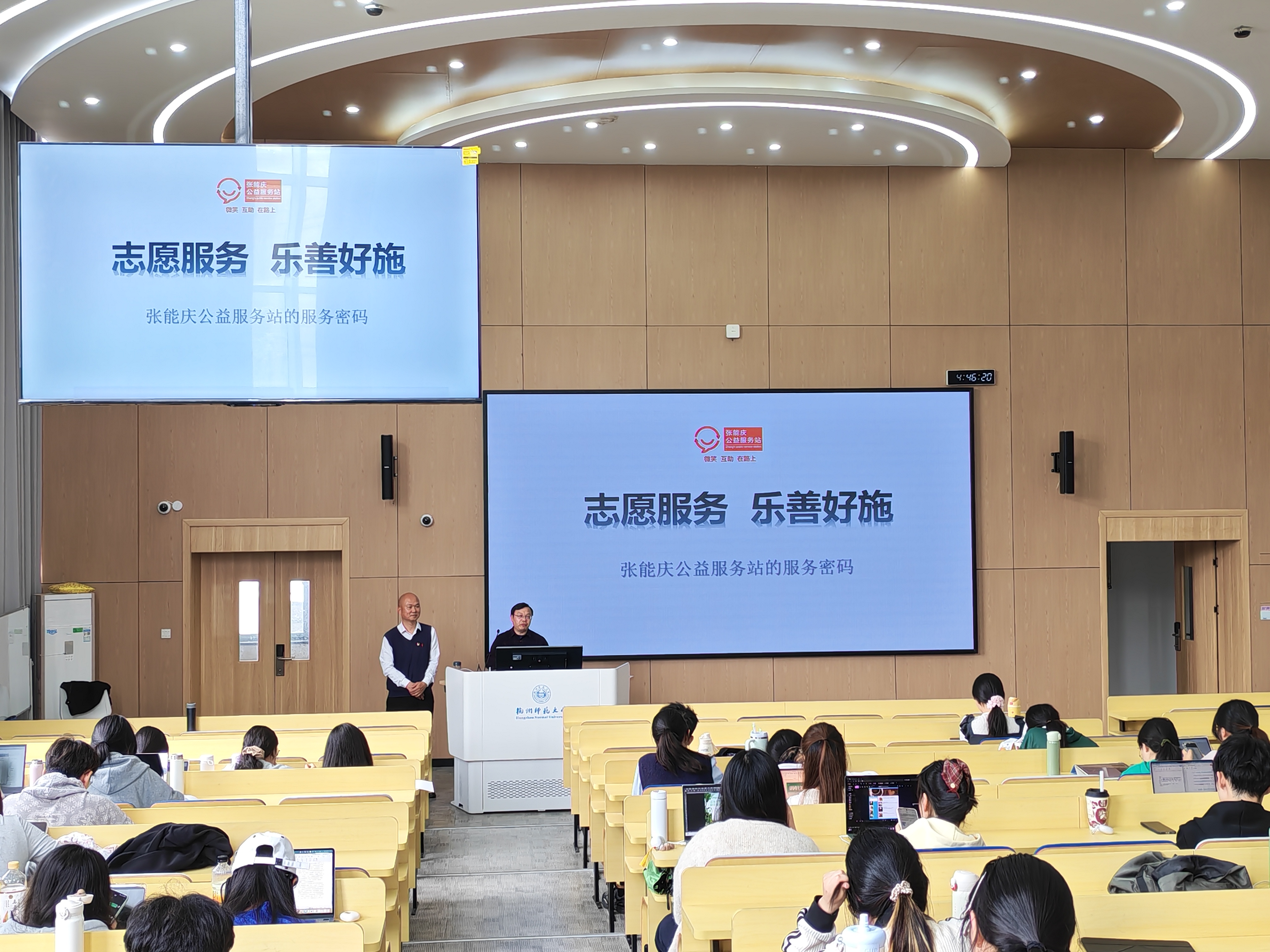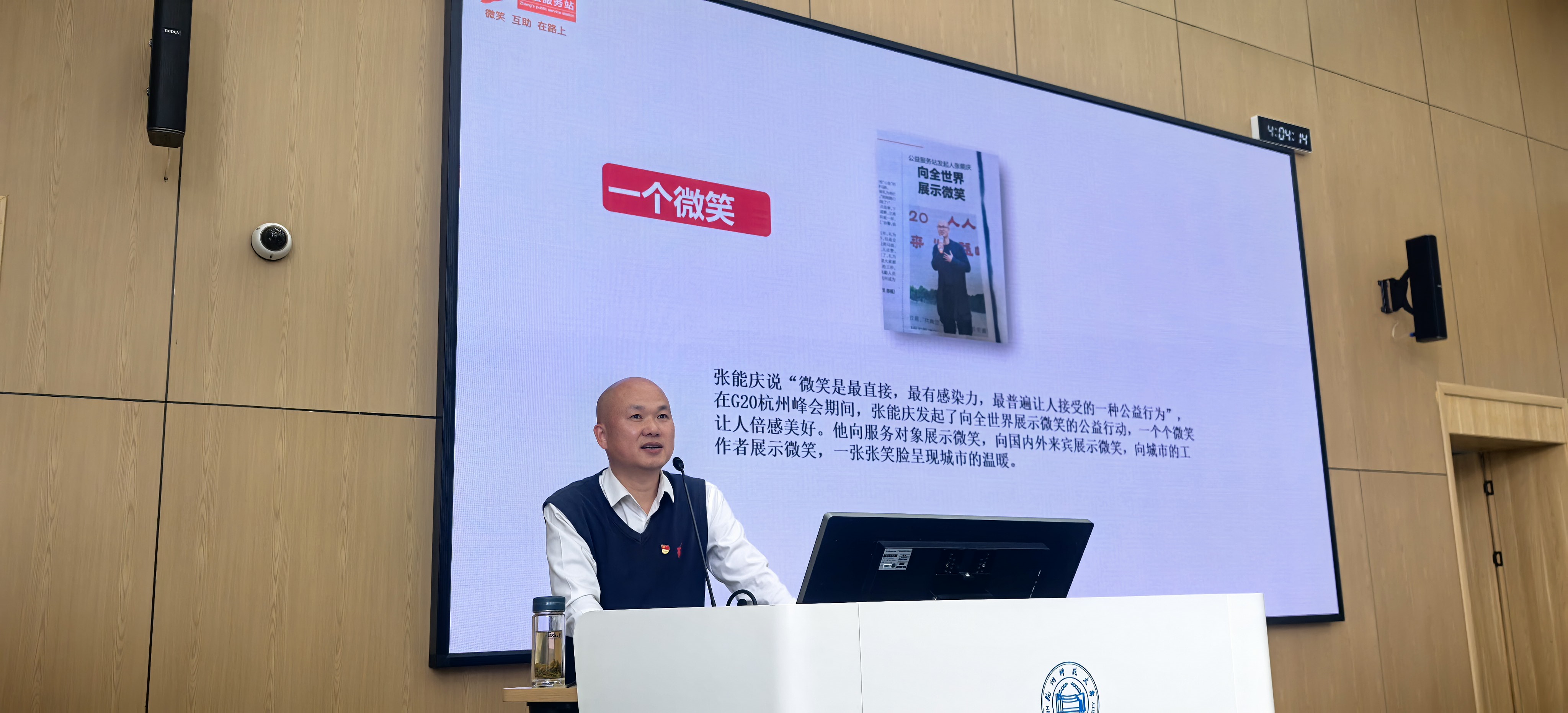 随后,张能庆老师向同学们展示了公益服务站党支部的“红色账本”:从G20峰会期间组织1.2万人次服务4万小时,到亚运期间发起“无烟西湖”行动清理百万烟蒂,再到“单车猎人”规范共享单车。他强调,党员身份不是“挂名”,而是“关键时刻站得出来”的行动力。通过照片再现G20、亚运等重大节点志愿服务的现场,结合党的二十届四中全会精神,解答了“党建引领”如何将善意凝聚成服务国家大局的硬核力量。